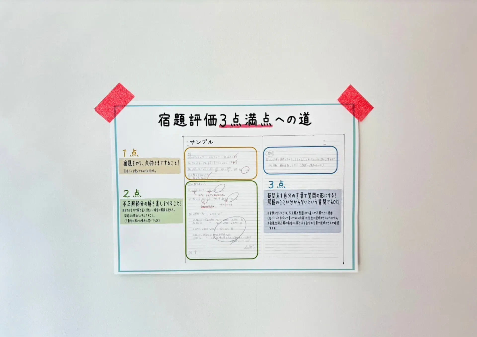 当塾では、生徒が宿題に対して主体的かつ自律的に取り組めるよう、「宿題評価」 という独自の制度を導入しています。